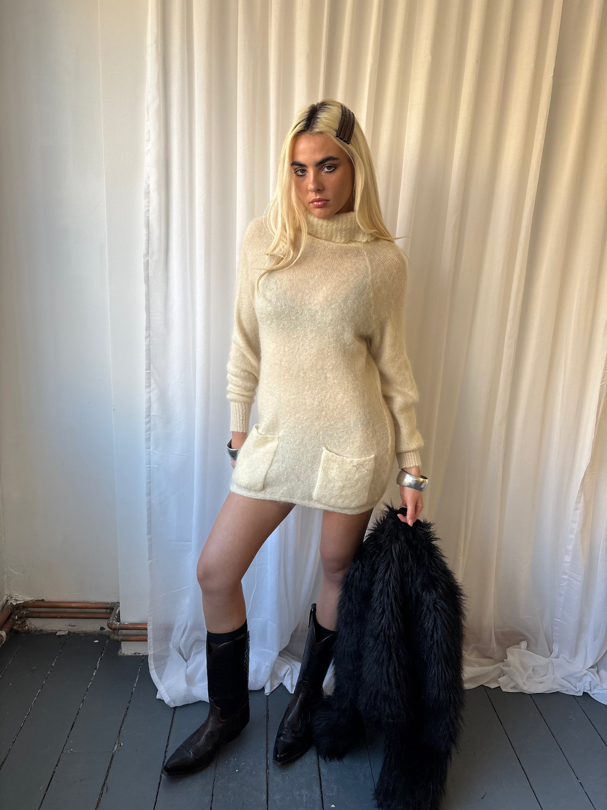 Anne Klein vintage cream mohair mix knit turtle neck dress/sweater with pockets.