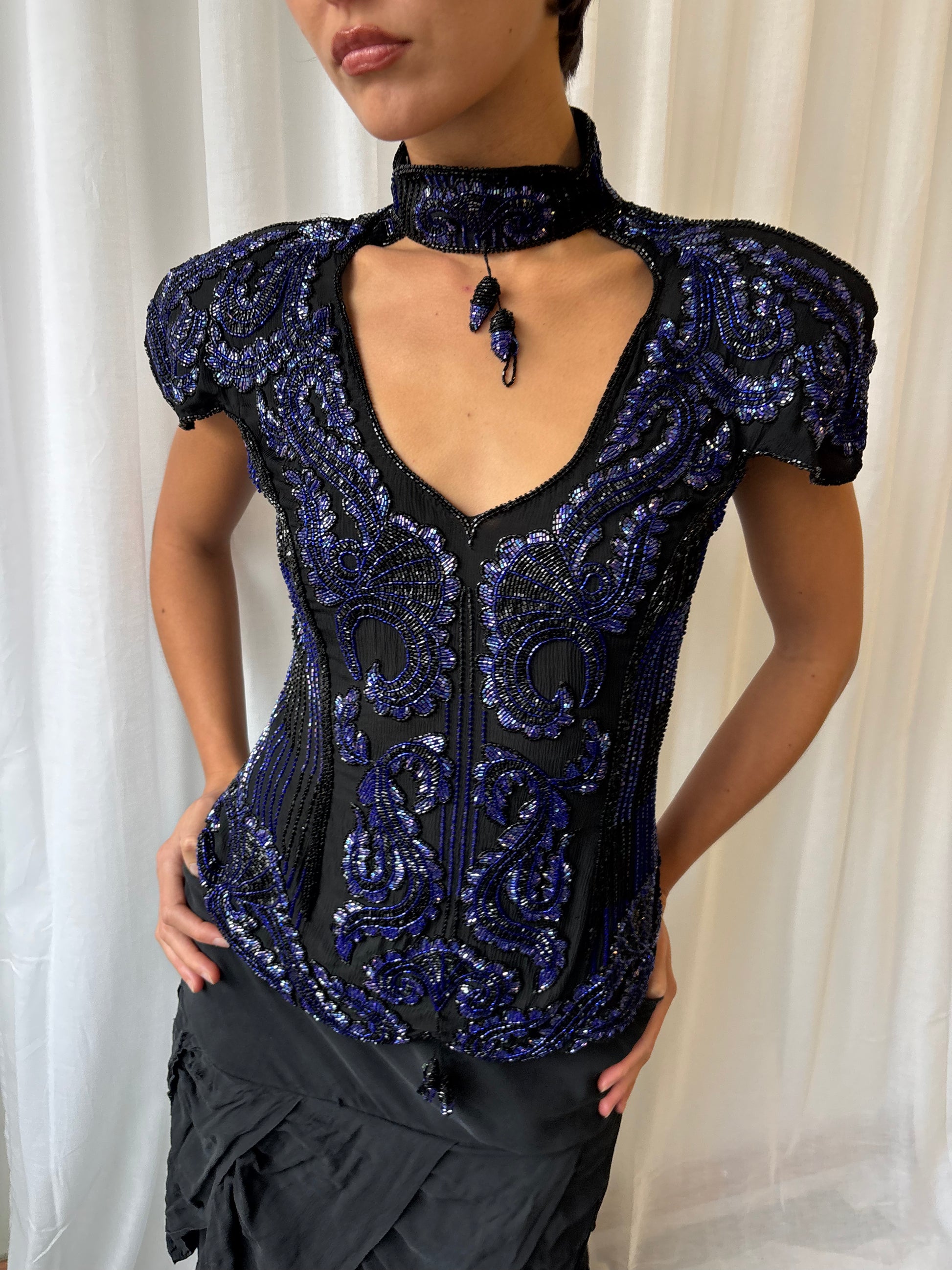 Eavis & Brown 1980s vintage blue and black beaded top with épaulettes and detachable belt.