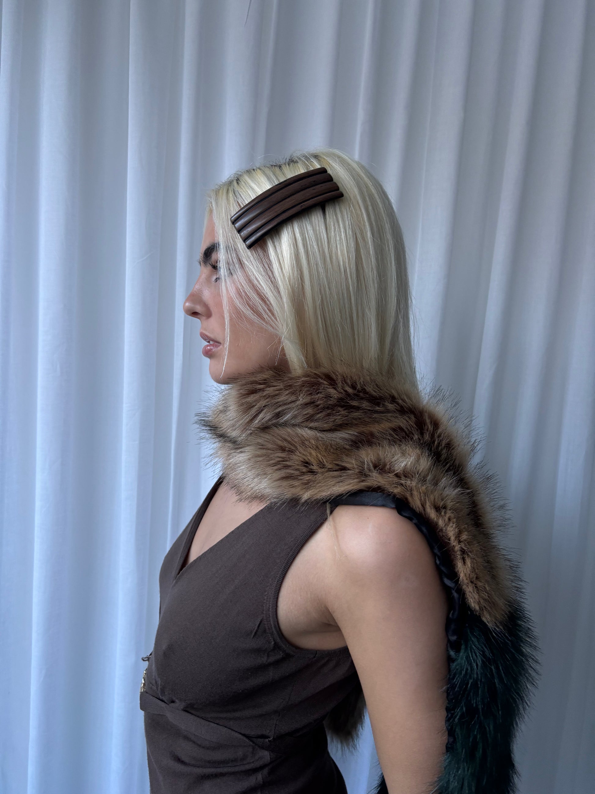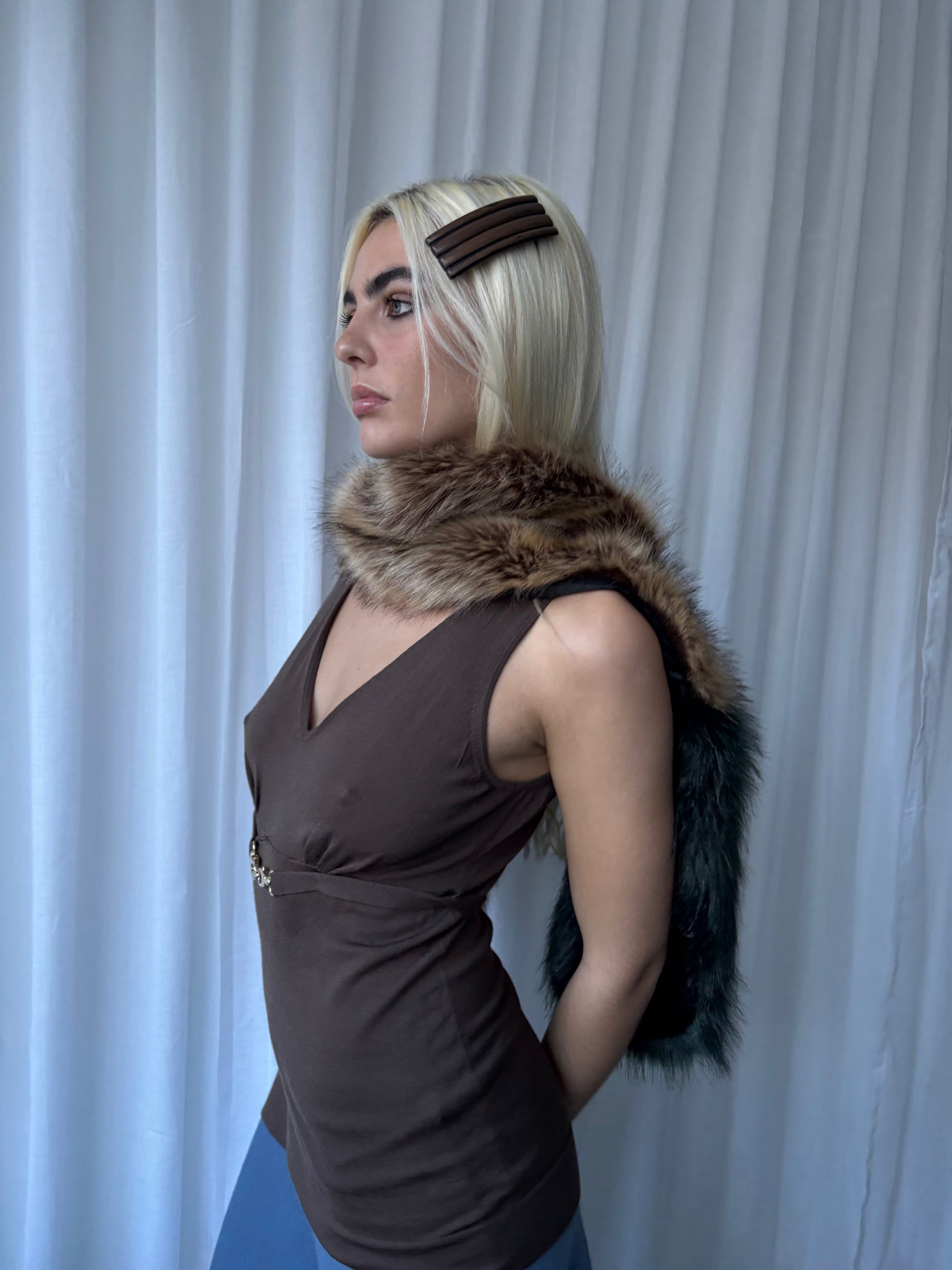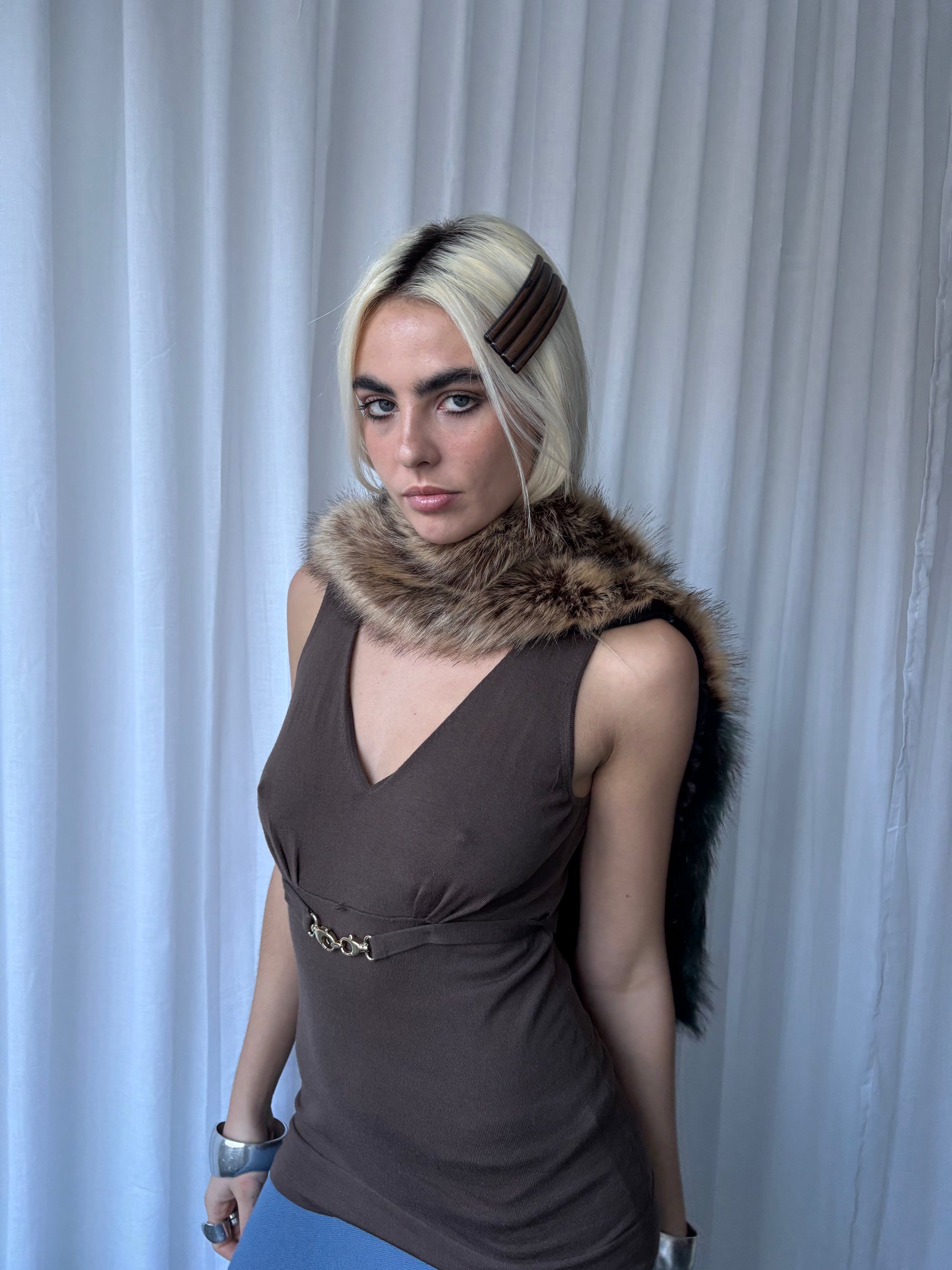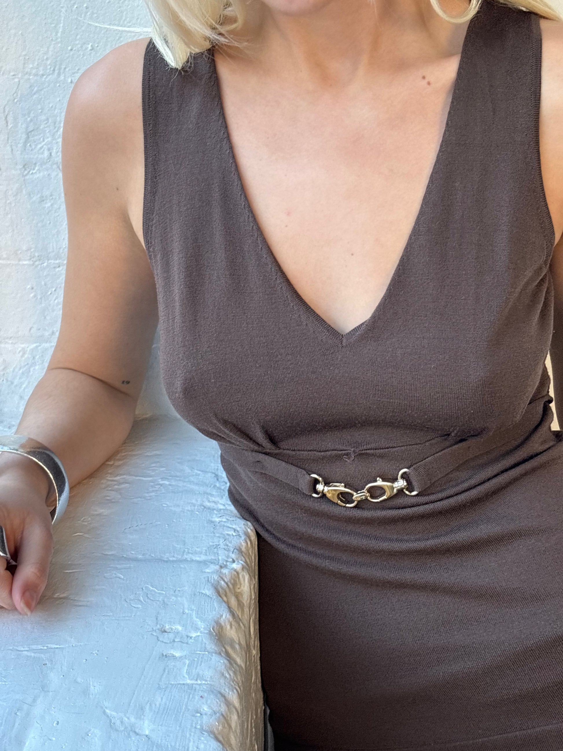 Gucci Tom Ford era chocolate fine knit v-neck top with gold logo clasp. Please note one pull at the front of the top, this could be sewn through into the lining of the top.