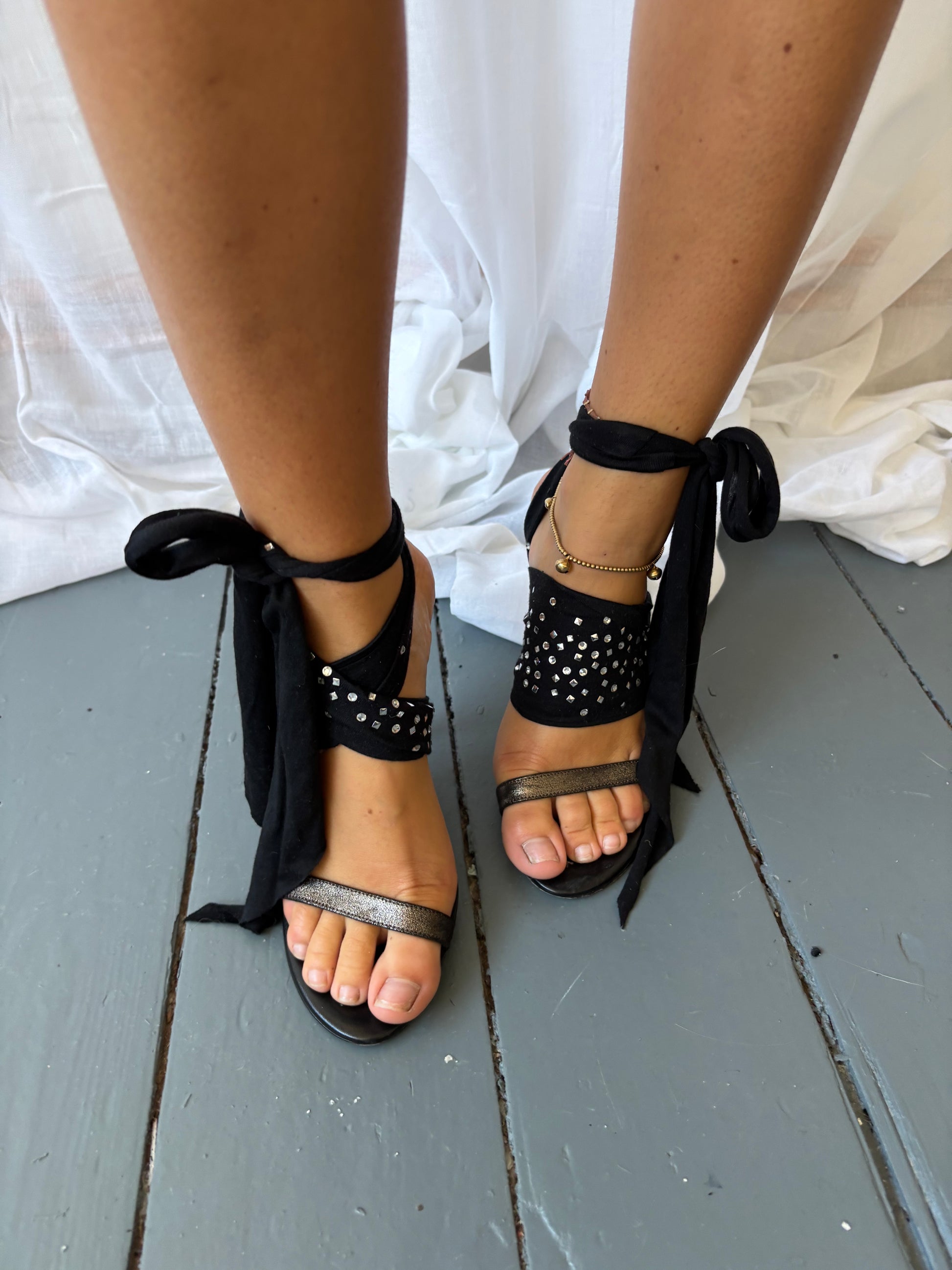 Patrizia Pepe grey metallic slip on heels with black crystal embossed ties- can be worn multiple ways. With box.