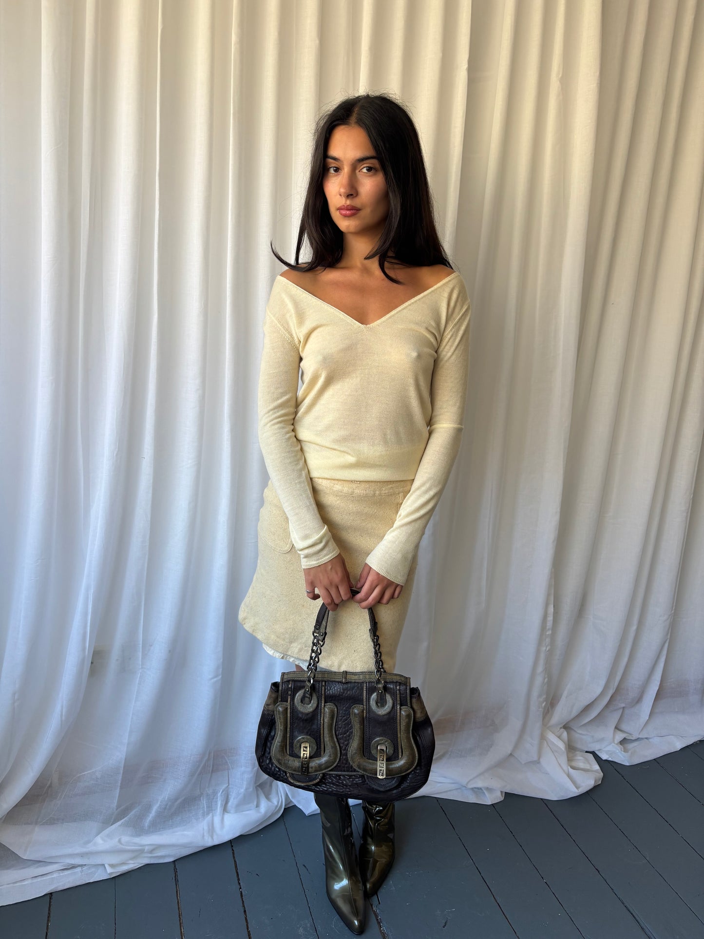 Prada butter yellow/cream fitted knit long sleeve v-neck top.
