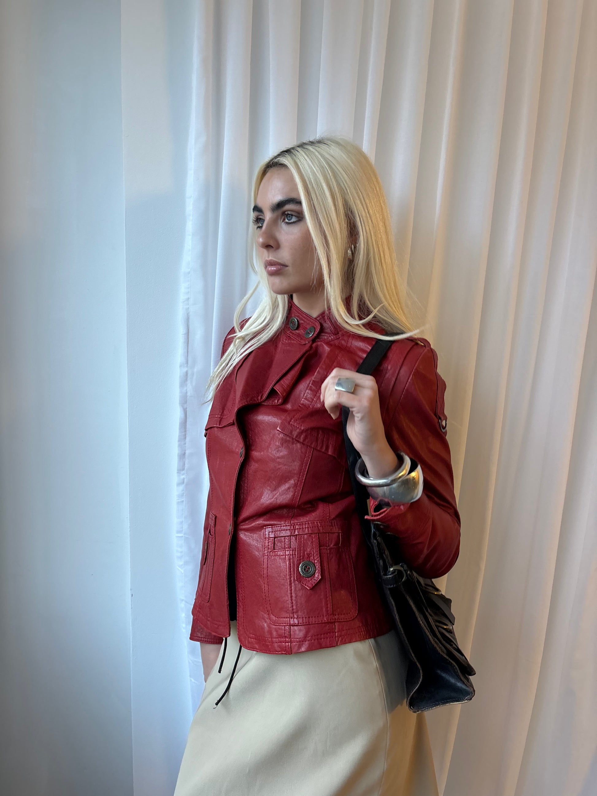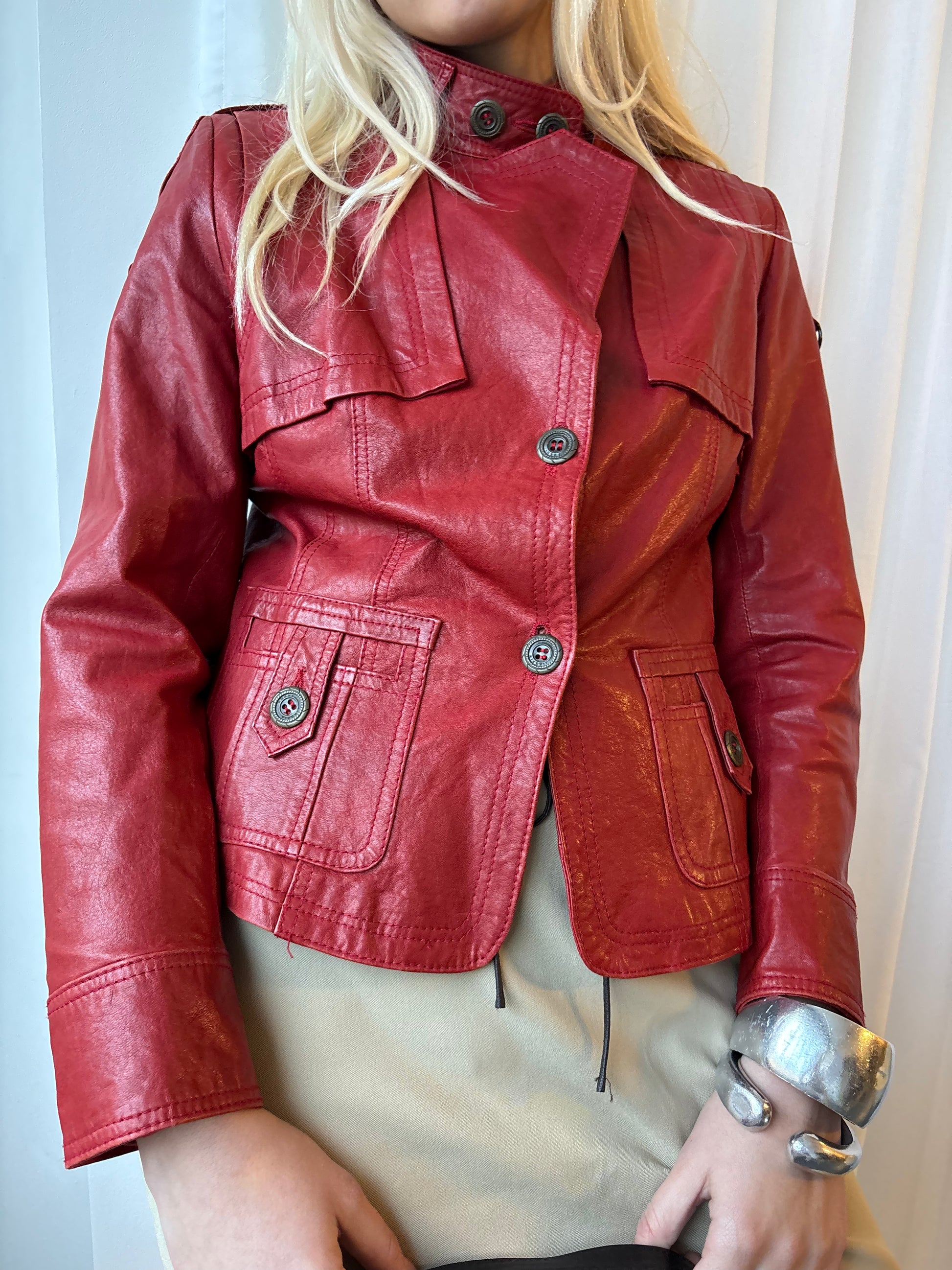 Vintage Baoivoqishi red leather jacket with buckle collar detail.