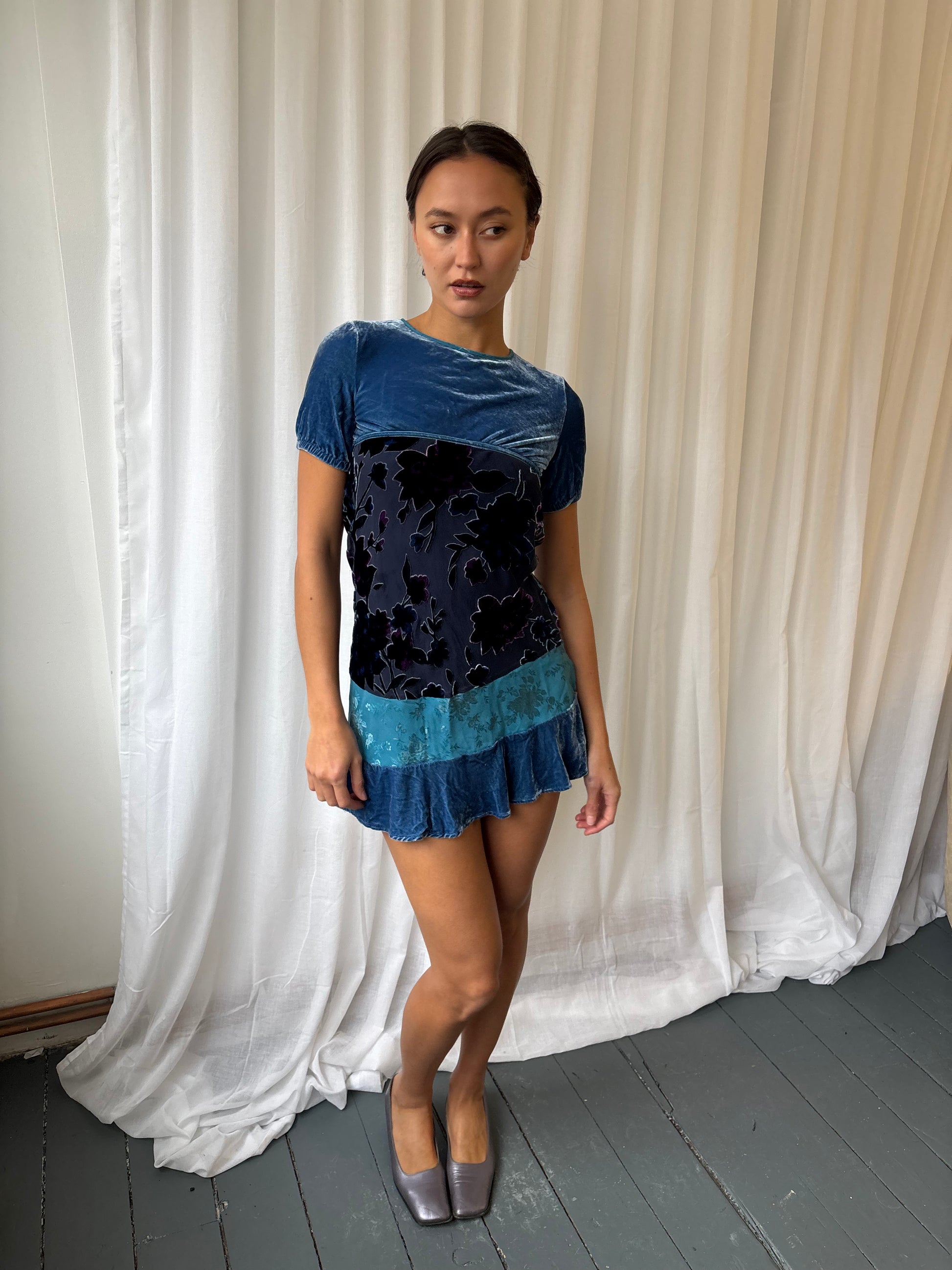 Vintage Monsoon blue velvet panelled mini dress/top with tie detail.