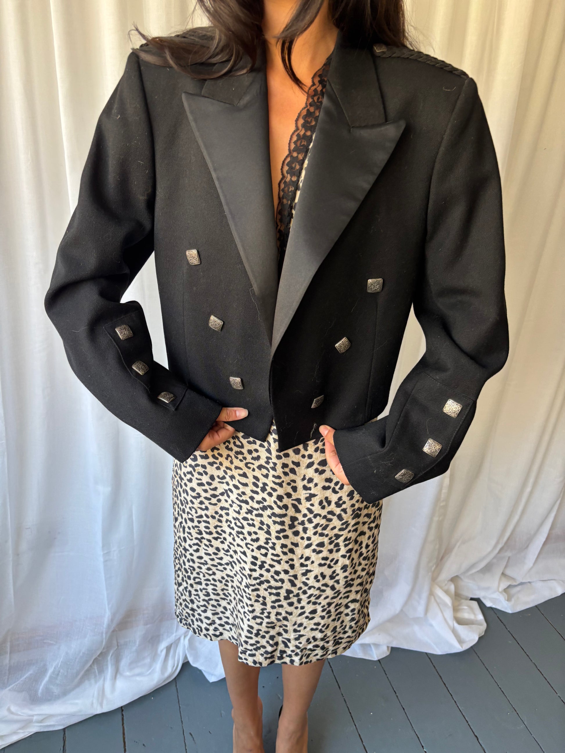 Vintage Scottish black menswear cropped oversized jacket with silver buttons and padded shoulders.