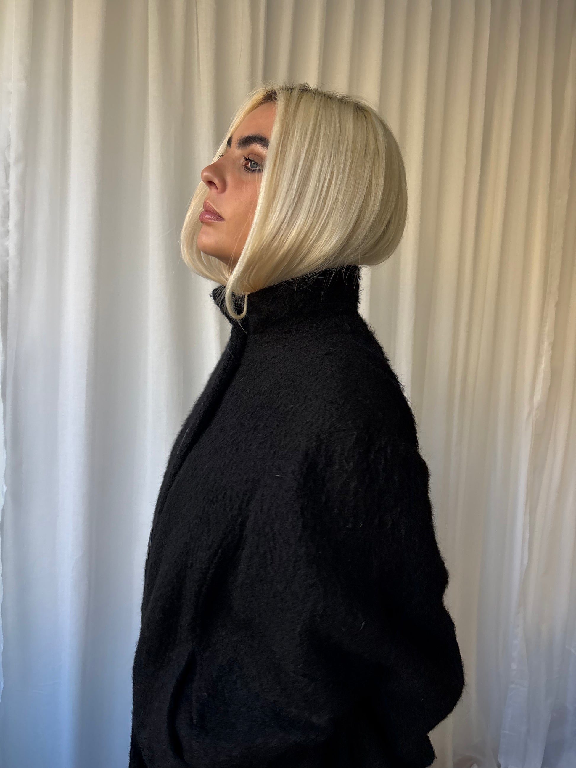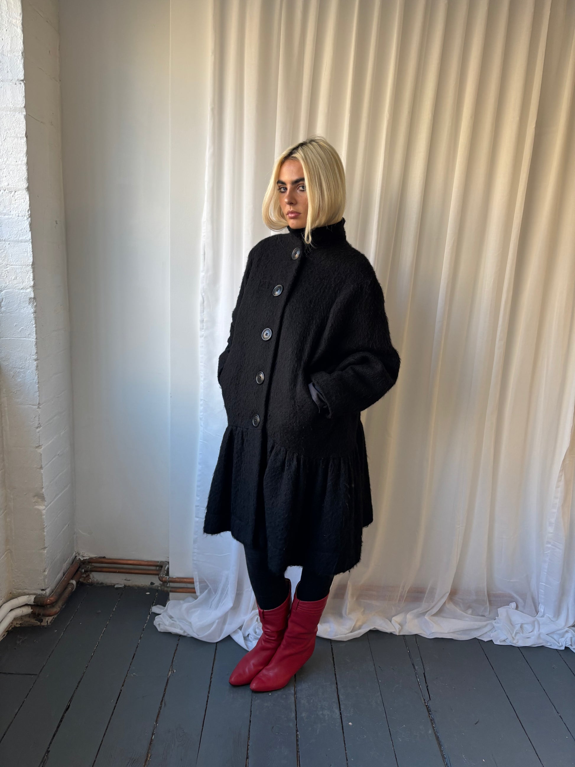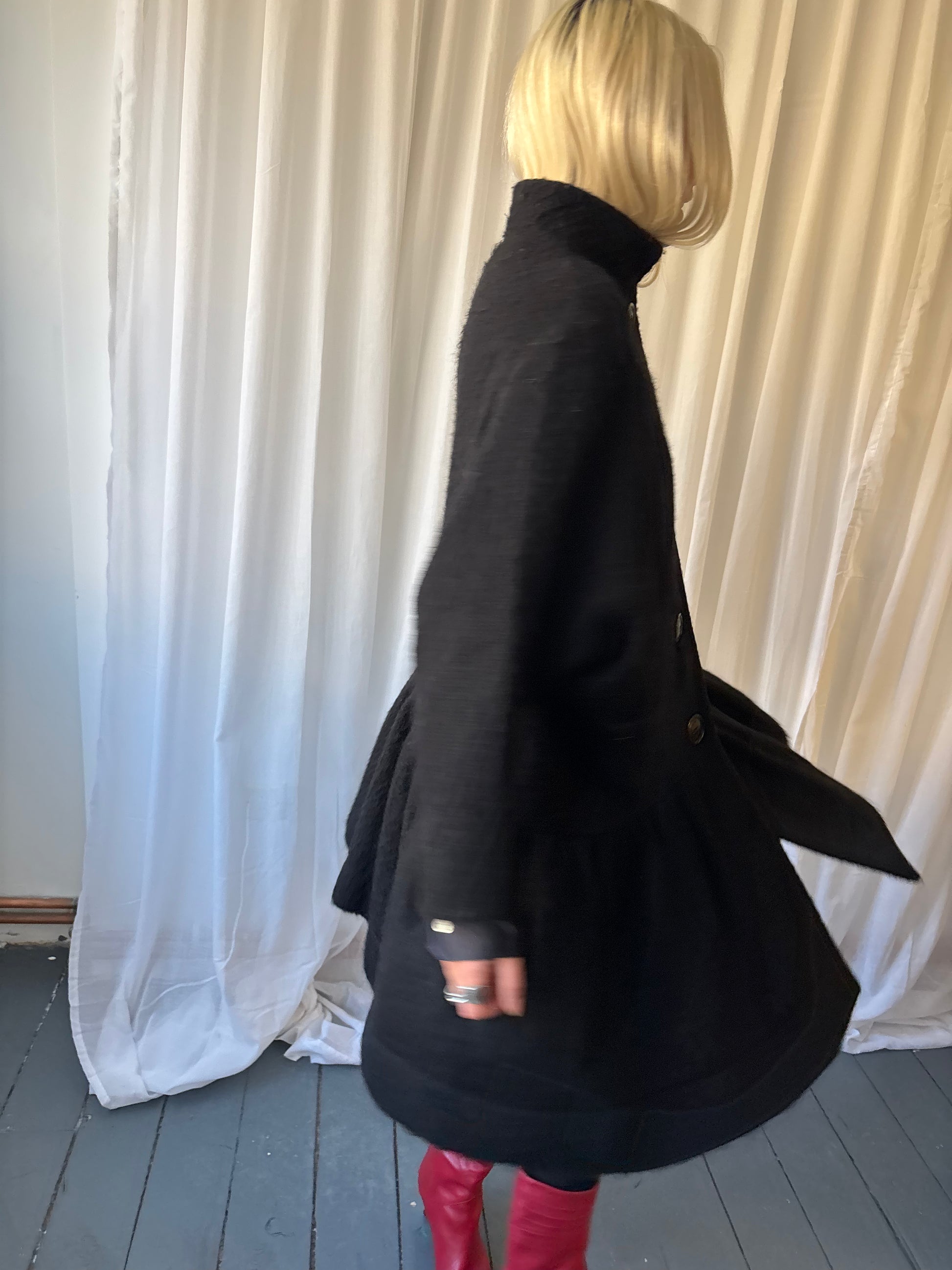 Vivienne Westwood Anglomania black oversized wool mix coat with drop waist peplum, cropped sleeves and large buttons.