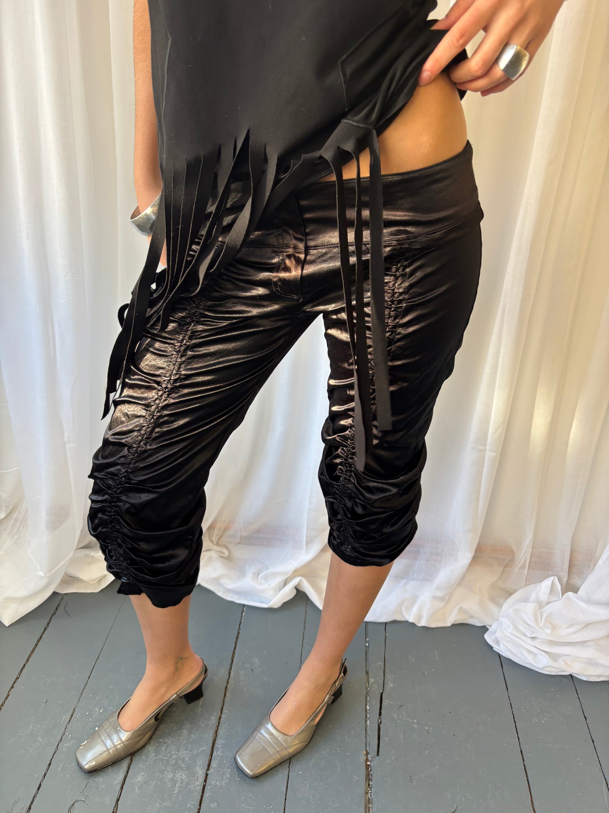 Vintage Parisian designer Voyage black satin ruched capris with adjustable toggle. Please note some discolouration on the front near fastening.